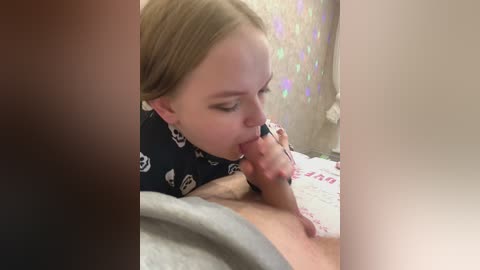 A video of a topless woman with glasses, light skin, and short blonde hair, sitting on a bed, holding a phone, in a cozy, dimly lit bedroom.