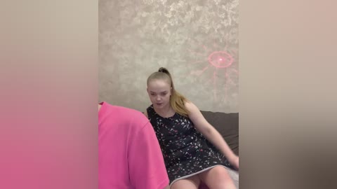 Video of a slender, blonde woman in a pink choker, sitting on a bed with a wooden headboard, in a cozy bedroom with floral artwork and a TV screen displaying weather data.