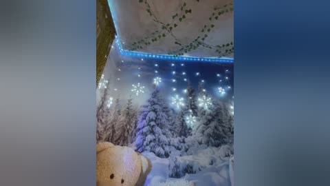 Video of a nude woman with fair skin and blonde hair, standing in a cozy room with a teddy bear and a snow-covered tree in the background.