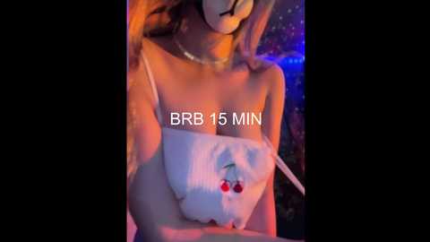 Video of a woman's side profile, wearing a white bikini top, standing in a dimly lit room with neon blue and red lighting. Text overlays: \"BRR 15 MIN.\