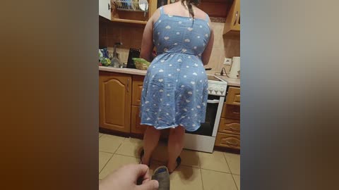 A video of a nude woman with medium breasts and light skin, wearing pink lace panties, standing in a dimly lit bedroom.