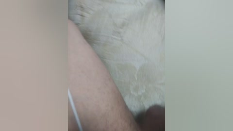 Video of a person's right arm, with a pale beige sleeve and a torn section revealing a glimpse of a darker skin tone. The background is blurred and neutral-toned.