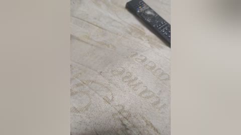 Video of a beige, patterned tablecloth with a smudged, indistinct object, likely a remote control, partially visible on the right. The tablecloth's texture appears slightly wrinkled, and the overall scene suggests a casual, cluttered setting.