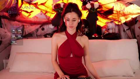 Video of a young woman with long dark hair, wearing a sleeveless purple dress, sitting on a bed adorned with festive decorations including red pillows, a Christmas tree, and a plush bunny.