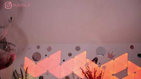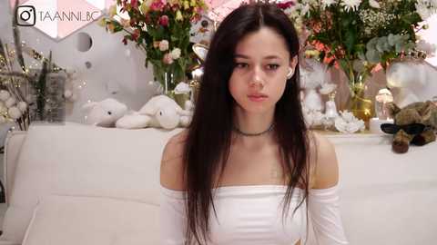 Video of a young woman with fair skin and dark hair, wearing pink lingerie, covering her face, in a whimsical, softly lit room with pastel decor and stuffed animals.