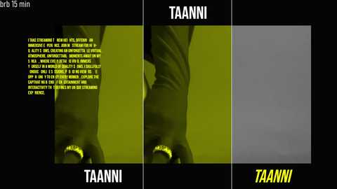 Video of a woman with wet hair, wearing a turquoise bikini, sunglasses, and a serene expression, standing on a sandy beach with palm trees and clear sky background. Text overlays read \"TAIMIUSTREAM Welcome\" and \"art 15min\" in white.