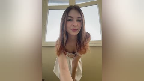 Video of a young woman with straight, light brown hair, wearing a white tank top, leaning forward, smiling. Background features a cream-colored wall and a large, frosted window.