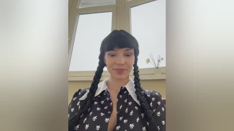 Video of a young woman with fair skin, black hair styled in twin braids, wearing a black blouse with white skull patterns and a white collar, indoors with a window behind her.