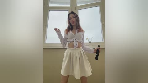 Video of a young Asian woman with long, straight, shoulder-length hair, wearing a white, tied-up crop top and a pleated white skirt, holding a black vibrator. She stands in front of a large, frosted window, with a neutral-toned room in the background.