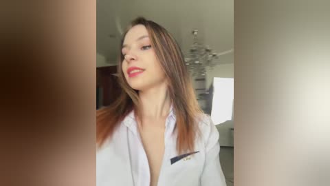 Video of a fair-skinned, slender woman with straight, shoulder-length brown hair, wearing a white shirt, standing in a modern, brightly lit room with a chandelier and white walls.