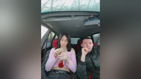 Video of a fair-skinned woman with long brown hair, wearing a black, high-cut, string bikini with minimal coverage, revealing ample cleavage and a flat stomach. She is seated on a black couch against a plain white wall, holding a pink object.