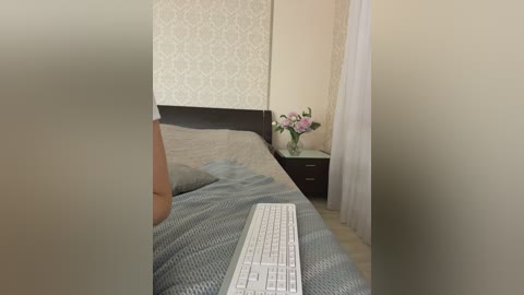 Video of a modern bedroom with a beige headboard, a gray and white striped bedspread, a white keyboard, and a floral vase on a dark wooden nightstand.
