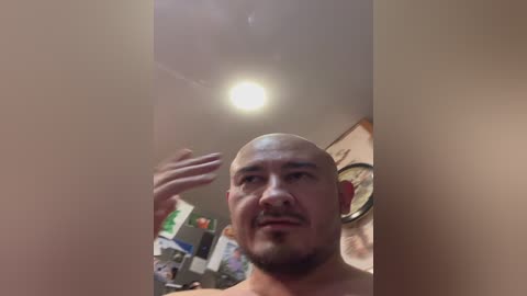 Video of a topless woman with medium-sized breasts, holding a large, realistic-looking dildo. She has shoulder-length dark hair and wears large hoop earrings. Background features a white door with a crystal chandelier.