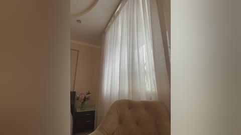 Video of a cozy, sunlit room with beige walls and a tufted armchair by a window draped with sheer white curtains. A vase of pink flowers sits on a dark wooden nightstand in the background.